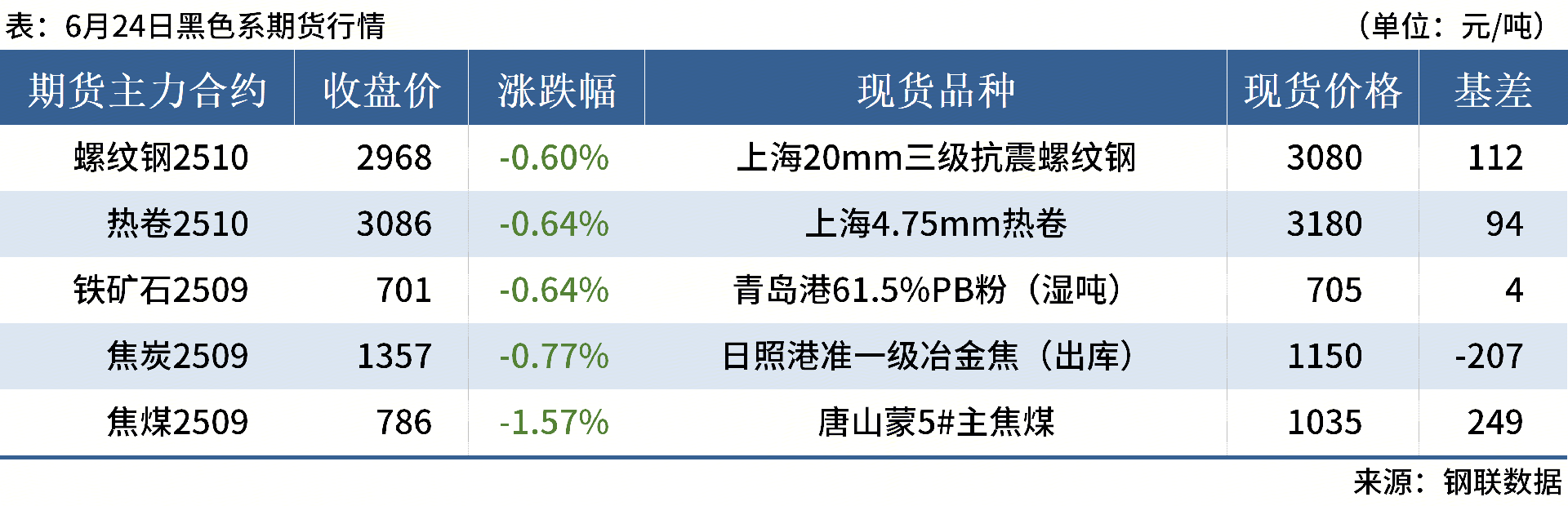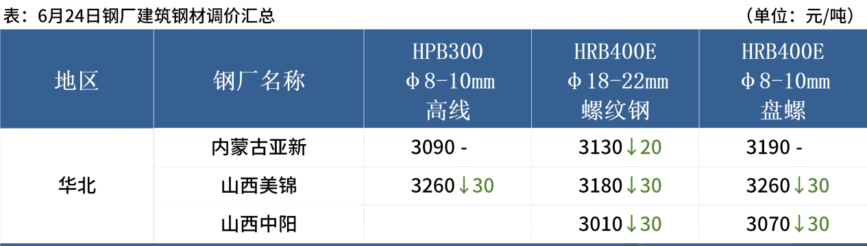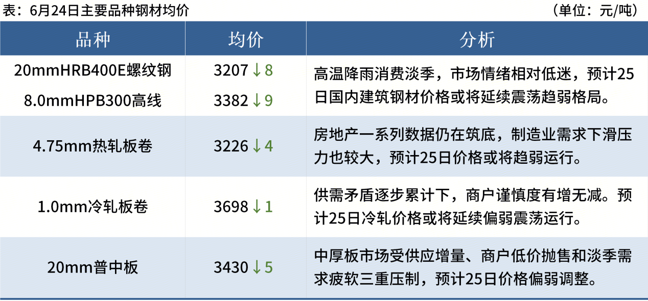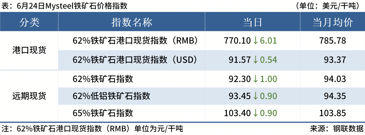 ◎ 6月24日,全國主港鐵礦石成交81.30萬噸,環(huán)比減31.2%;237家主流貿易商建筑鋼材成交9.32萬噸,環(huán)比減9.5%。