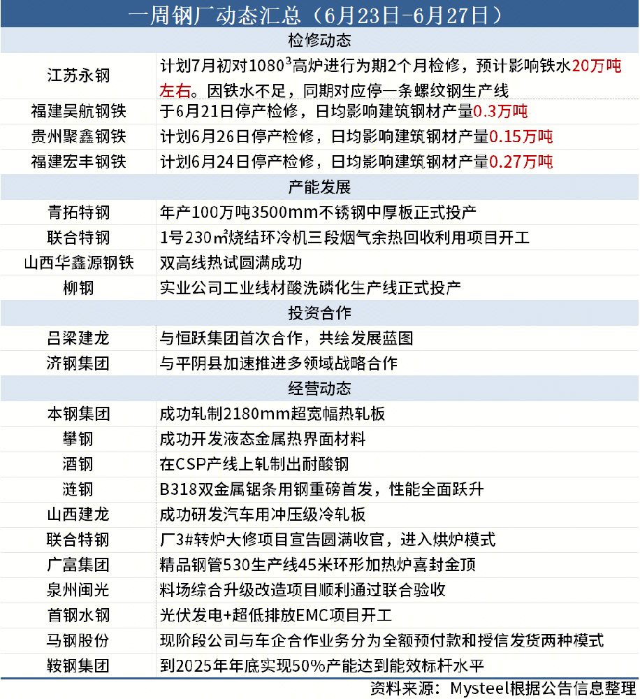 據(jù)Mysteel不完全統(tǒng)計(jì),本周(6月23日-6月27日)4家鋼廠發(fā)布檢修信息,具體如下: