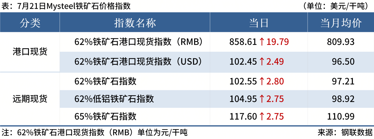 ◎ 7月21日,Mysteel進(jìn)口鐵礦石62%澳洲粉礦遠(yuǎn)期現(xiàn)貨指數(shù)102.55,漲2.8,月均97.21;65%巴西粉礦遠(yuǎn)期現(xiàn)貨指數(shù)117.6,漲2.75,月均110.99。(單位:美元/干噸)