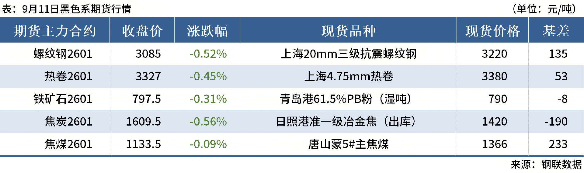 ◎9月11日,全國主港鐵礦石成交112.40萬噸,環(huán)比增73.5%;237家主流貿(mào)易商建筑鋼材成交9.19萬噸,環(huán)比減1.2%。